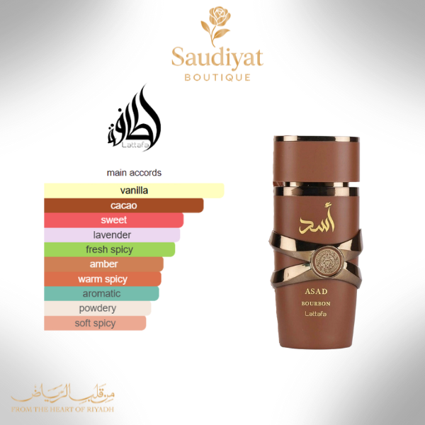 Asad Bourbon by Lattafa Perfumes is a Oriental Spicy fragrance for men. This is a new fragrance. Asad Bourbon was launched in 2025. Top notes are Lavender, Mirabelle and Pink Pepper; middle notes are Cacao, Nutmeg and Davana; base notes are Bourbon Vanilla, Amber and Vetiver.