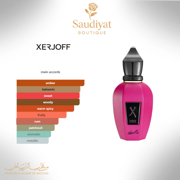 Duran Duran NeoRio by Xerjoff is a Oriental fragrance for women and men. This is a new fragrance. Duran Duran NeoRio was launched in 2025. Top notes are Fig, Rum, Labdanum and elemi; middle notes are Maple syrup, Saffron and Rose Oil; base notes are Peru Balsam, Patchouli and Tonka Bean.