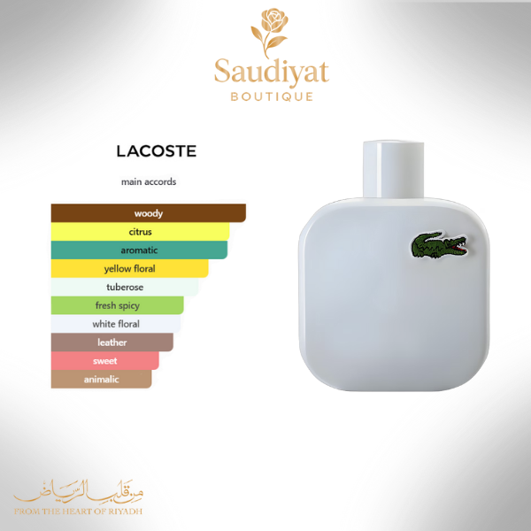 Eau de Lacoste L.12.12. White by Lacoste Fragrances is a Woody Aromatic fragrance for men. Eau de Lacoste L.12.12. White was launched in 2011. Top notes are Grapefruit, Rosemary and Cardamom; middle notes are Ylang-Ylang and Tuberose; base notes are Virginia Cedar, Suede, Vetiver and Leather.