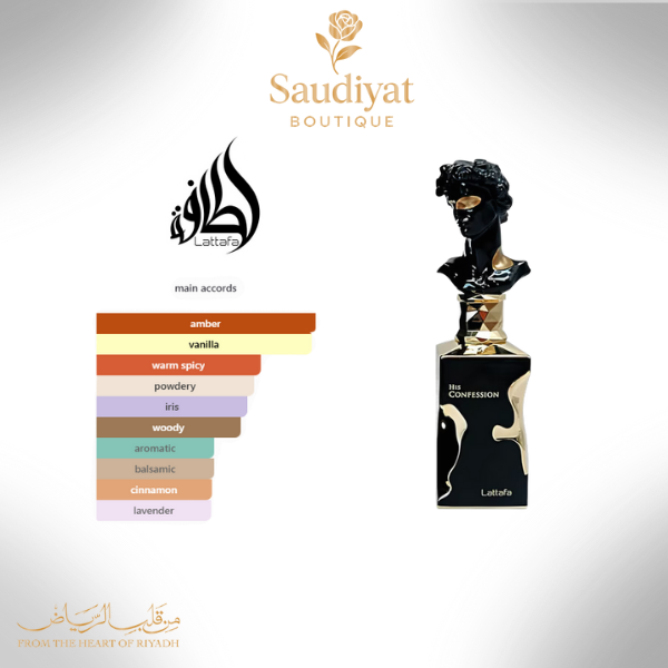 His Confession by Lattafa Perfumes is a Oriental Woody fragrance for men. This is a new fragrance. His Confession was launched in 2024. Top notes are Cinnamon, Lavender and Mandarin; middle notes are Iris, Benzoin, Cypress and Mahonial; base notes are Vanilla, Tonka, Amber, Incense, Cedarwood and Patchouli.