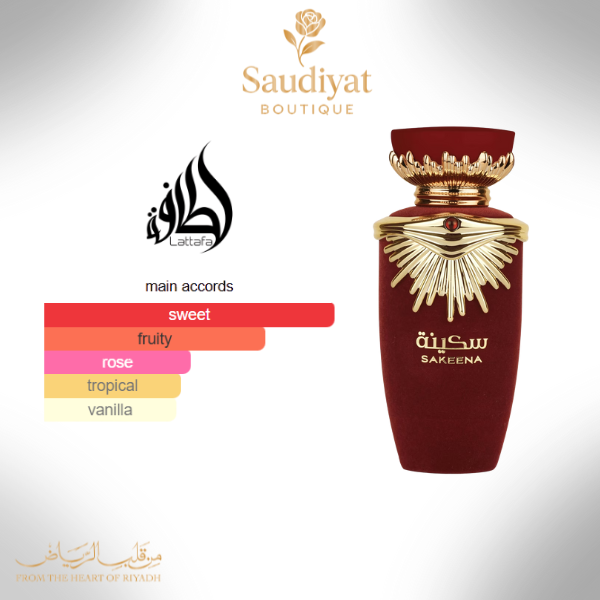 Sakeena by Lattafa Perfumes is a Floral Fruity Gourmand fragrance for women. Sakeena was launched in 2022. Top notes are Passionfruit, Ozonic notes and Mandarin Orange; middle notes are Raspberry, Rose, Sea Salt and Orange Blossom; base notes are Toffee, Praline, Vanilla and Musk.